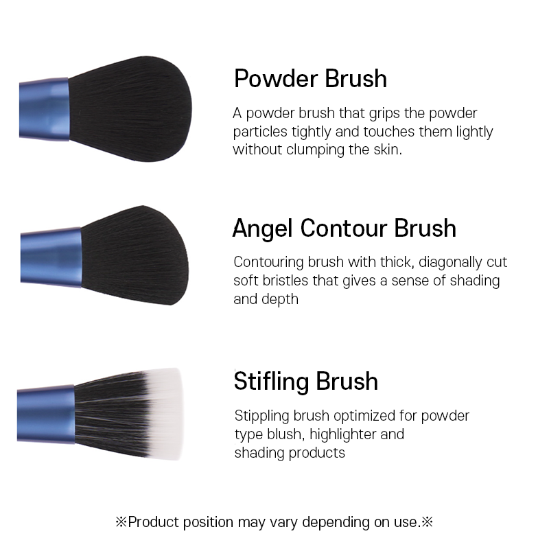 | Description | ▶ Product Features - Possible to change hair, ferrule, handle color and material - Possible to print own logo ▶ Lead time - It takes 6~70 days ▶ Product color - Hair: Black - Ferrule + handle: blue & black ▶ Product size 1. Powder brush : Hair 50mm / Ferrule+Handle 130mm 2. Angle contour brush : Hair 35mm / Ferrule+Handle 130mm 3. Stifling brush : Hair 35mm / Ferrule+Handle 130mm |