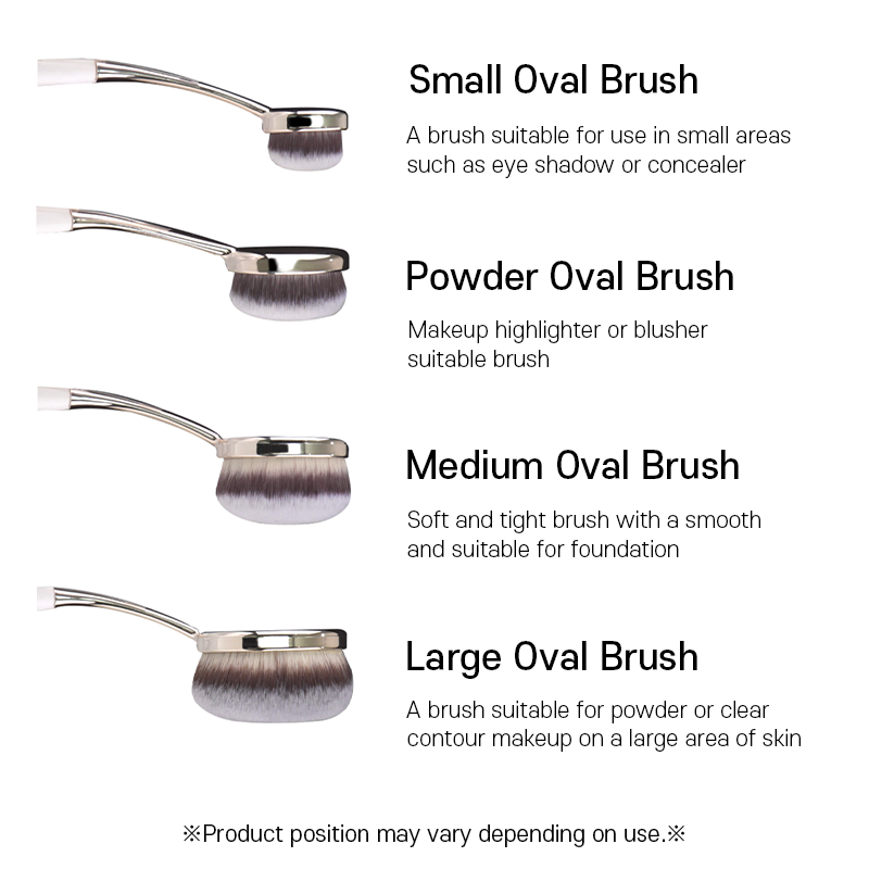| Description | ▶ Product Features - Possible to change hair, ferrule, handle color and material - Possible to print own logo ▶ Lead time - It takes 6~70 days ▶ Product color - Hair: Brown & Silver - Ferrule: Gold - Handle: White ▶ Product size 1. Small oval brush : Hair 22mm / Ferrule+Handle 115mm 2. Powder oval brush : Hair 32mm / Ferrule+Handle 112mm 3. Medium oval brush :Hair 35mm / Ferrule+handle 112mm 4. Large oval brush :Hair 45mm / Ferrule+Handle 110mm |