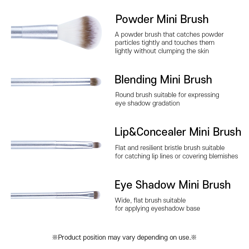 | Description | ▶ Product Features - Mini brush set, easy to carry - Possible to change hair, ferrule, handle color and material - Possible to print own logo ▶ Lead time - It takes 6~70 days ▶ Product color - Hair: Brown & White - Ferrule + Handle: Silver ▶ Product size 1. Powder mini brush : Hair 34mm / Ferrule+Handle 80mm 2. Blending mini brush : Hair 10mm / Ferrule+Handle 101mm 3. Lip & concealer mini brush : Hair 9mm / Ferrule+Handle 101mm 4. Eye shadow mini brush : Hair 7mm / Ferrule+Handle 103mm |