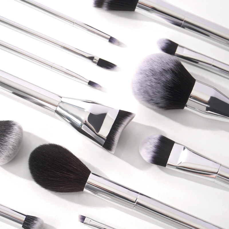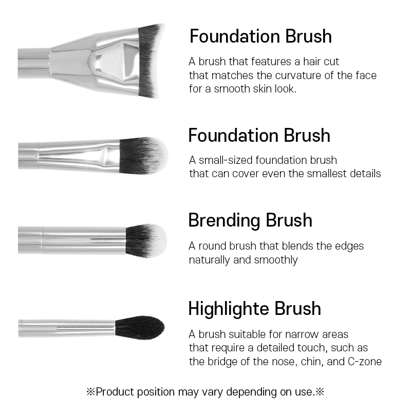 | Description | ▶ Product Features - A set of brushes with various configurations - Possible to change hair, ferrule, handle color and material - Possible to print own logo ▶ Lead time - It takes 6~70 days ▶ Product color - Hair: Black & White - Ferrule + Handle: Silver ▶ Product size 1. Big powder brush : Hair 58mm / Ferrule 45mm / Handle 98mm 2. Powder brush : Hair 54mm / Ferrule 40mm / Handle 98mm 3. Foundation brush : Hair 32mm / Ferrule 45mm / Handle 98mm 4. Stippling brush : Hair 42mm / Ferrule 45mm / Handle 98mm 5. Foundation brush : Hair 15mm / Ferrule 50mm / Handle 98mm 6. Foundation brush : Hair 13mm / Ferrule 35mm / Handle 112mm 7. Blending brush : Hair 22mm / Ferrule 30mm / Handle 112mm 8. Highlight brush : Hair 13mm / Ferrule 35mm / Handle 110mm 9. Eyeshadow brush : Hair 10mm / Ferrule 35mm / Handle 110mm 10. Concealer brush : Hair 12mm / Ferrule 35mm / Handle 110mm 11. Concealer brush : Hair 13mm / Ferrule 35mm / Handle 110mm 12. Eyebrow brush : Hair 6mm / Ferrule 35mm / Handle 110mm 13. Eye point brush : Hair 10mm / Ferrule 35mm / Handle 110mm |