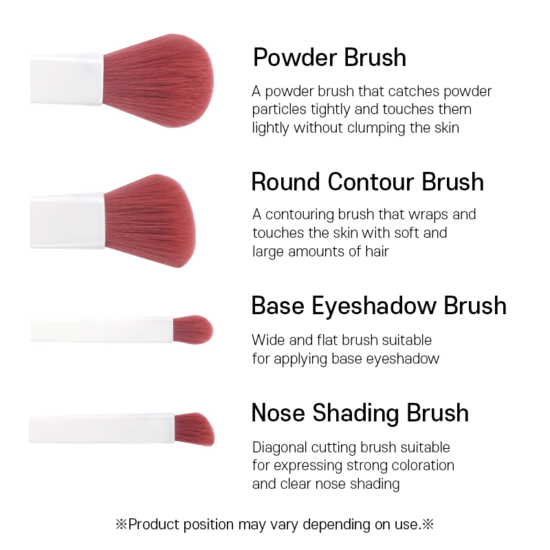 | Description | ▶ Product Features - Mini brush set with red sunset mood - Possible to change hair, ferrule, handle color and material - Possible to print own logo ▶ Lead time - It takes 6~70 days ▶ Product color - Hair: White - Handle: Red ▶ Product size 1. Powder brush : Hair 40mm / Handle 105mm 2. Round contour brush : Hair 34mm / Handle 105mm 3. Base eye shadow brush : Hair 14mm / Handle 116mm 4. Nose shading brush : Hair 12mm / Handle 116mm 5. Lip&Concealer brush : Hair 10mm / Handle 117mm 6. Eyebrow shading brush : Hair 7mm / Handle 117mm |